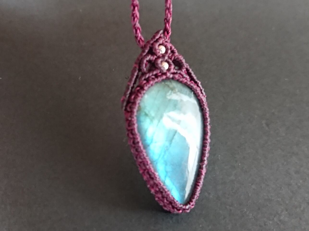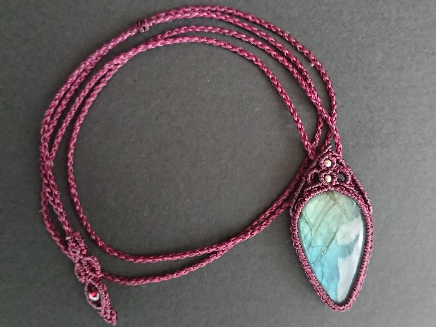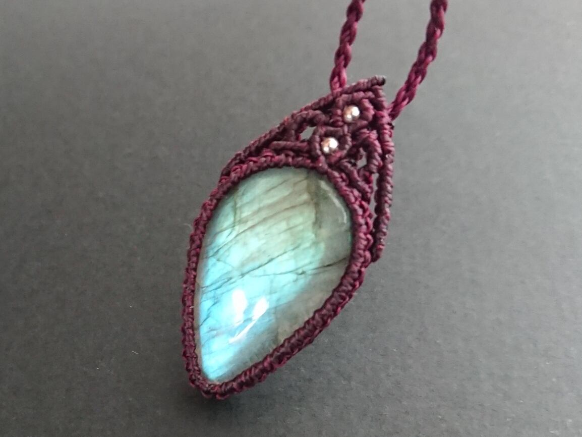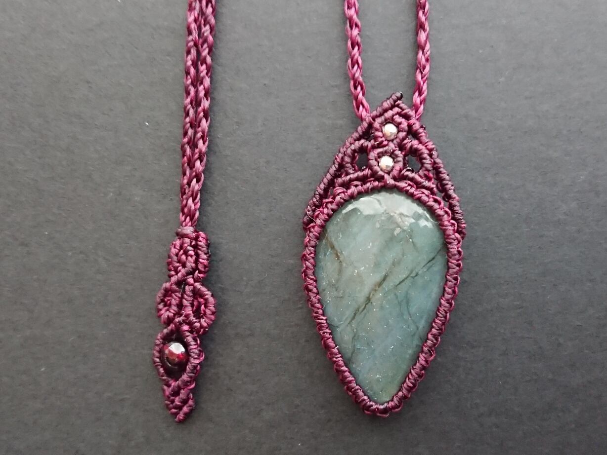 明るいグラデーションが浮かび上がる、ラブラドライトのマクラメ編みネックレス